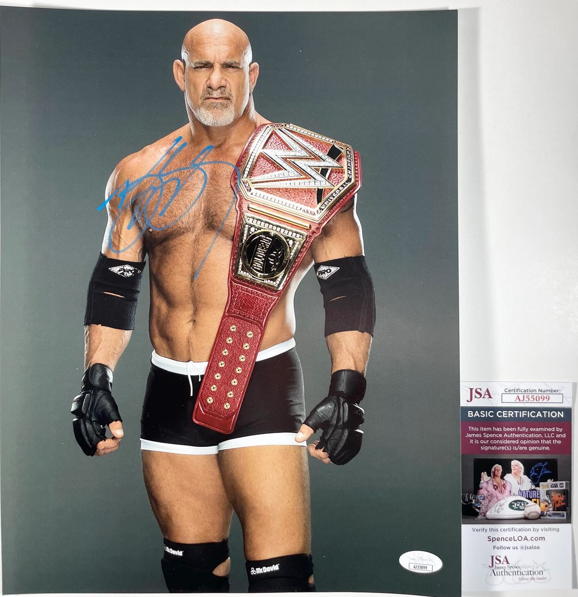 Professionally printed 11×14 photo, hand signed by WWE Hall Of Fame Superstar, former WCW and WWE World Heavyweight Champion, Bill Goldberg. This is a clean, well placed signature that really pops off of this crisp, professionally printed 11×14 photo. Item has been authenticated by James Spence Authentications, and includes the JSA Certificate Of Authenticity card. JSA COA# AJ55099