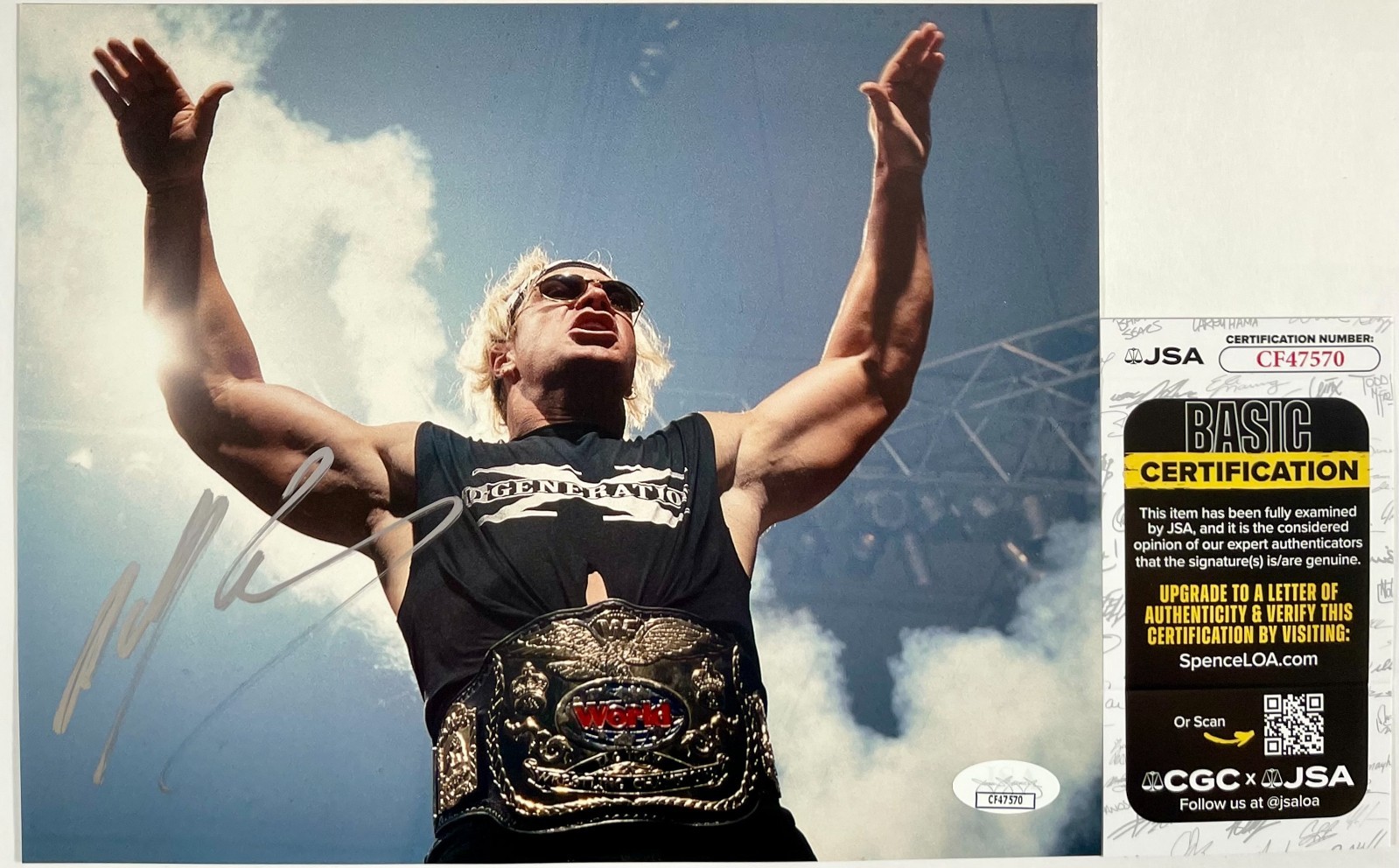 Professionally printed 8×10 photo, hand signed in person by Hall Of Fame WWE Superstar, one half of the legendary New Age Outlaws Tag Team, and a member of Degeneration-X (DX), the “Bad A$$” Billy Gunn. Today Billy works for Tony Khan’s All Elite Wrestling (AEW).  This is a clean, well placed signature, signed in a flowing Silver DECCO Paint Pen that really pops off of this crisp, professionally printed 8×10 photo.  A clear plastic 8×10 toploader is included with purchase to safely ship the photo inside of.  Item has been authenticated by James Spence Authentication, one of the most reputable third-party authentication companies in the world, and includes the JSA Certificate Of Authenticity card.