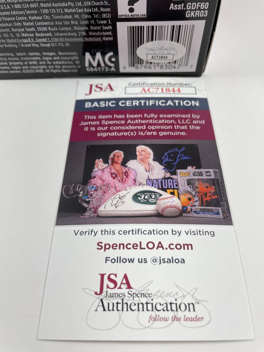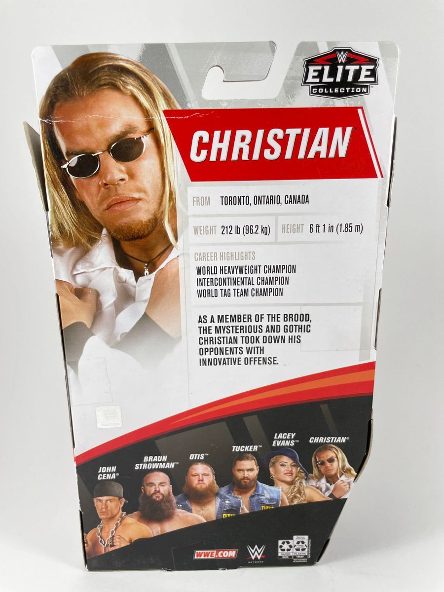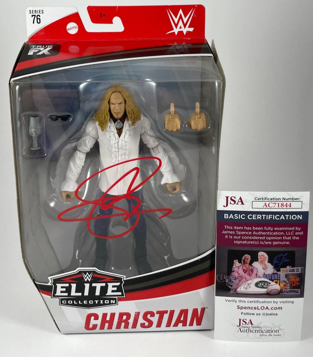 Christian WWE Mattel Elite Series 76 Wrestling Figure, hand signed by former IMPACT Wrestling and WWE Superstar, currently a member of the All Elite Wrestling (AEW) roster, Christian. This is a clean, well placed signature, signed in a flowing Red 2 MM Molotow paint pen that really pops off of the plastic. Please be advised before purchasing the box is not being sold as mint as there are some minor flaws, mostly to the back of the box. Figure still displays incredibly as you can see in the photos provided. Item has been authenticated by James Spence Authentications, and includes the JSA Certificate of Authenticity card. JSA COA# AC71844