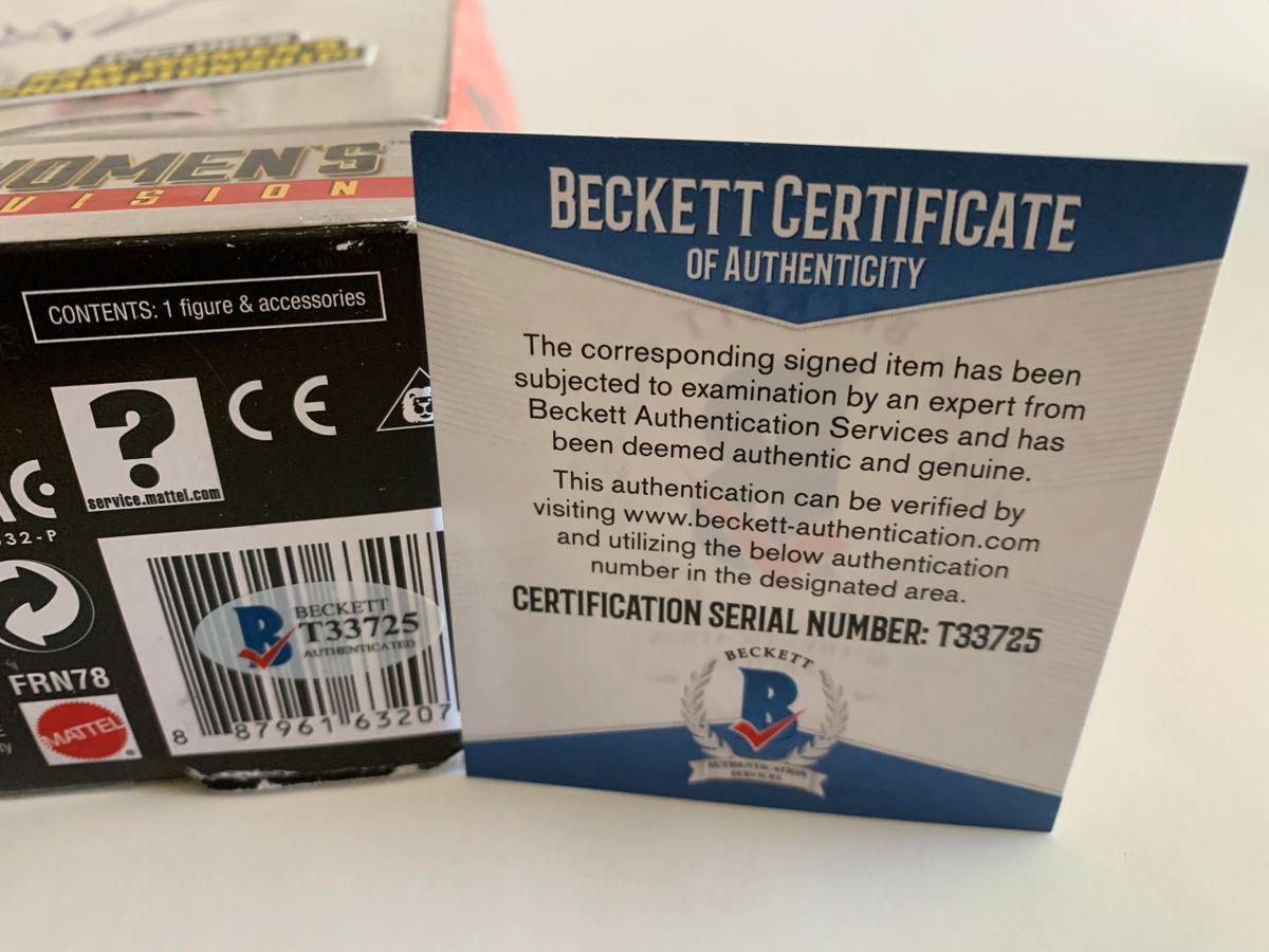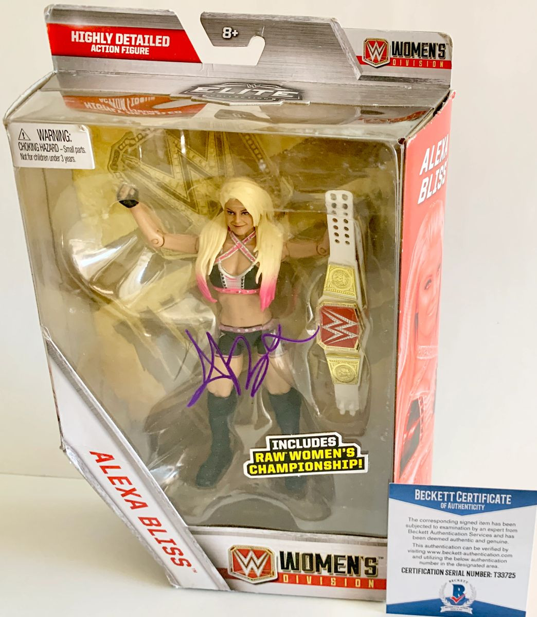 Alexa Bliss WWE Mattel Elite Walgreens Exclusive Women’s Division Wrestling Figure, hand signed in person by the first WWE Superstar to win the Smackdown and RAW Women’s Championships, “The Goddess” Alexa Bliss. This is a clean, perfectly placed signature, signed in a flowing Purple 2 MM Molotow Paint Pen that really pops off of the plastic. Figure will ship inside of a plastic figure defender case, however keep in mind figure is not mint as there are some flaws to the packaging, however figure still displays great as you can see in the photos. Item has been authenticated by Beckett Authentication Services, one of the most reputable third-party authentication companies in the world and includes the Beckett Certificate of Authenticity card.
