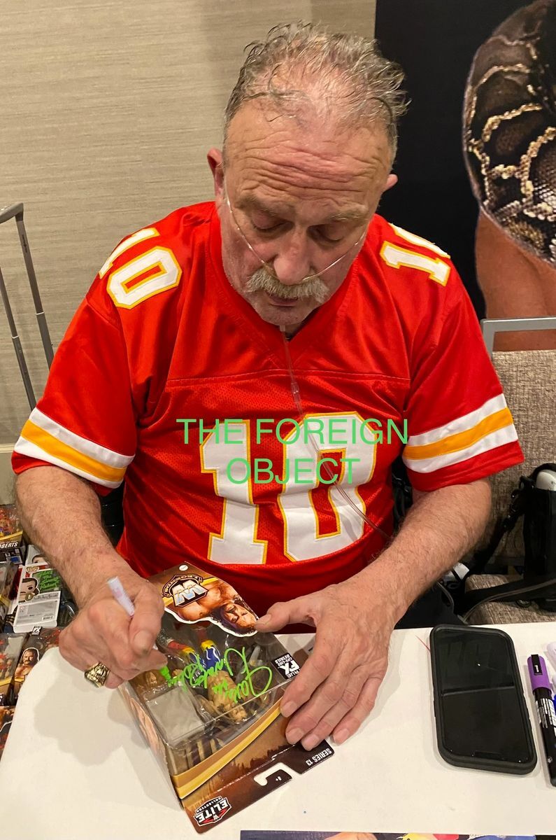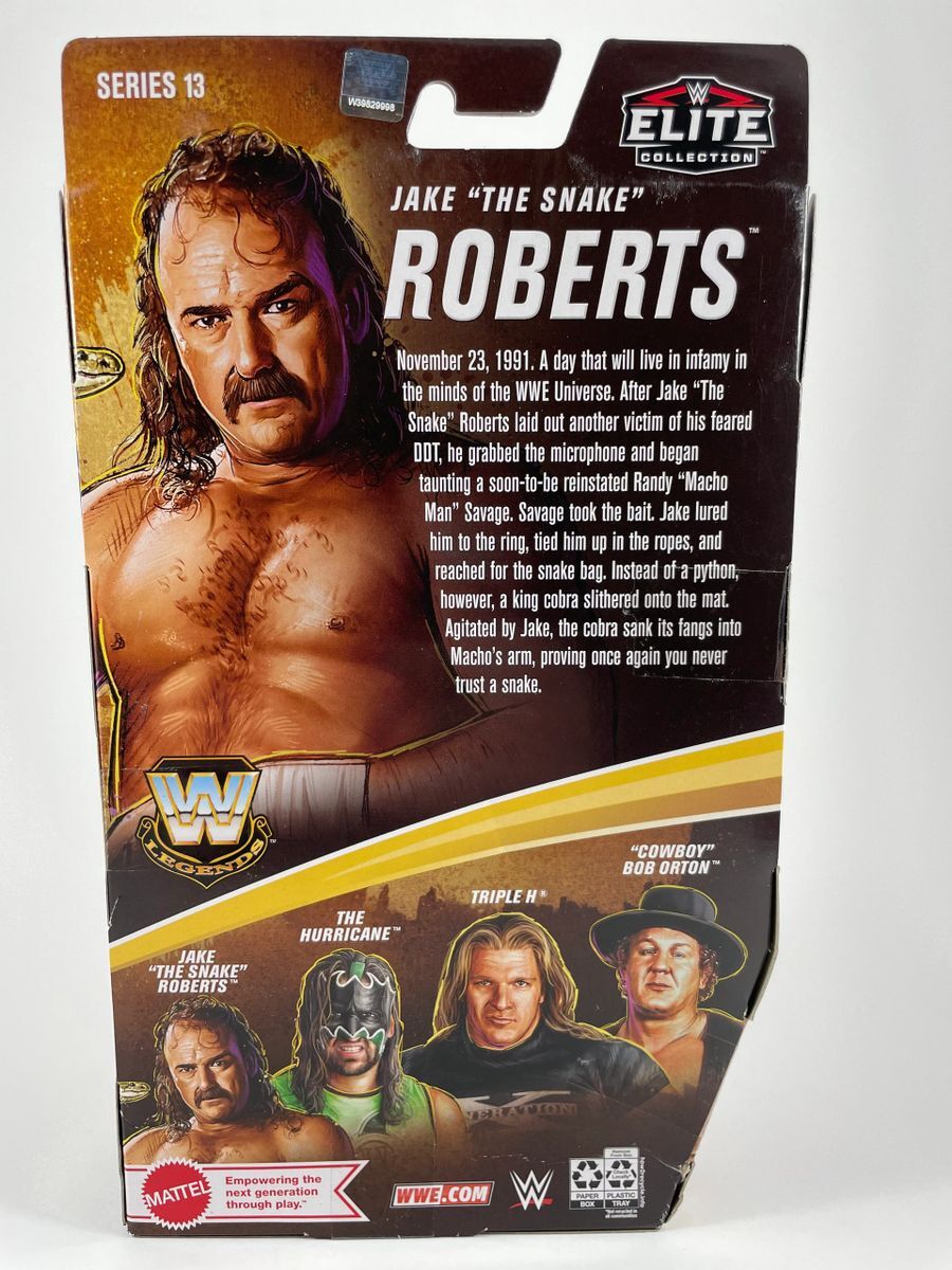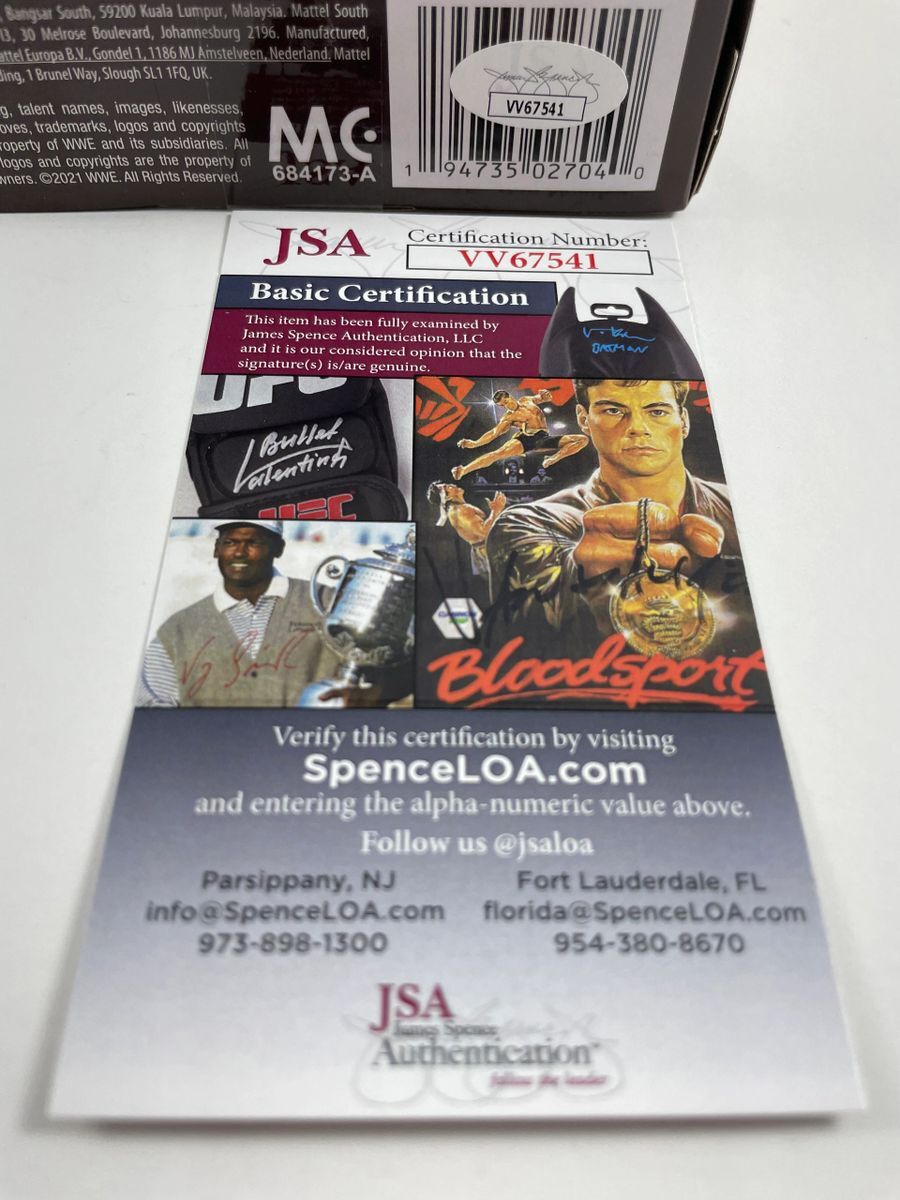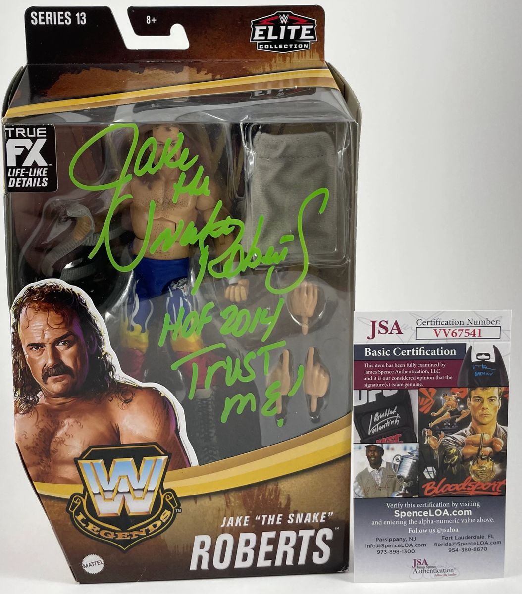 Jake “The Snake” Roberts WWE Mattel Legends Elite Series 13 Wrestling Figure, hand signed in person by WWE Hall of Fame Superstar Jake “The Snake” Roberts. This is a clean, well placed signature, with “HOF 2014” and “Trust Me!” inscriptions, signed in a flowing Green 2MM Decco paint pen that really pops off of the plastic. Item has been authenticated by James Spence Authentications, one of the most reputable third party authentication companies in the world, and includes the JSA Certificate of Authenticity card.