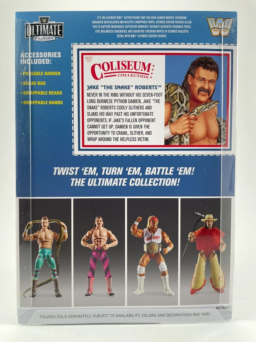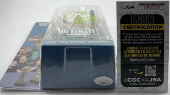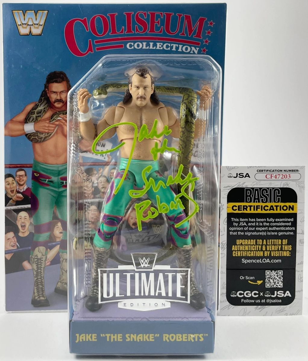Jake “The Snake” Roberts WWE Mattel Ultimate Coliseum Collection Wrestling Figure, hand signed in person by WWE Hall of Fame Superstar, Jake “The Snake” Roberts. This is a clean, well placed signature, signed in a flowing Green 2MM Molotow paint pen that really pops off of the plastic. Item has been authenticated by James Spence Authentications, one of the most reputable third-party authentication companies in the world, and includes the JSA Certificate of Authenticity card.