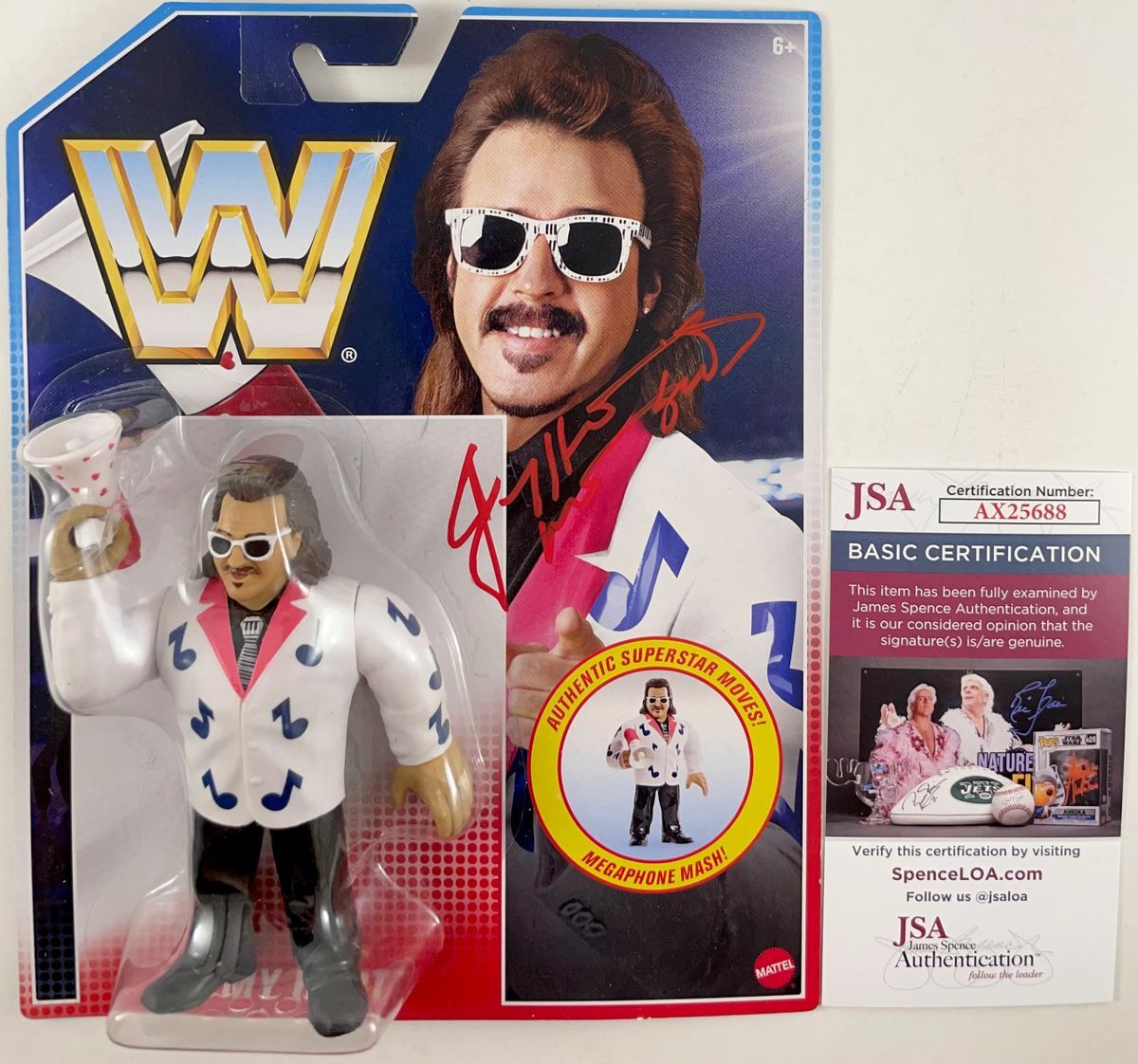 Jimmy Hart WWE Mattel Retro Wrestling Figure, hand signed in person by WWE Hall of Fame Superstar, long time WWF and WCW manager, “The Mouth Of The South” Jimmy Hart. This Mattel Retro figure is very similar to the old WWF Hasbro figures from the late eighties and early nineties. This is a clean, well placed signature, signed in a flowing Red 2MM Molotow paint pen that really pops off of the card backing. Item has been authenticated by James Spence Authentications, one of the most reputable third-party authentication companies in the world and includes the JSA Certificate of Authenticity card.