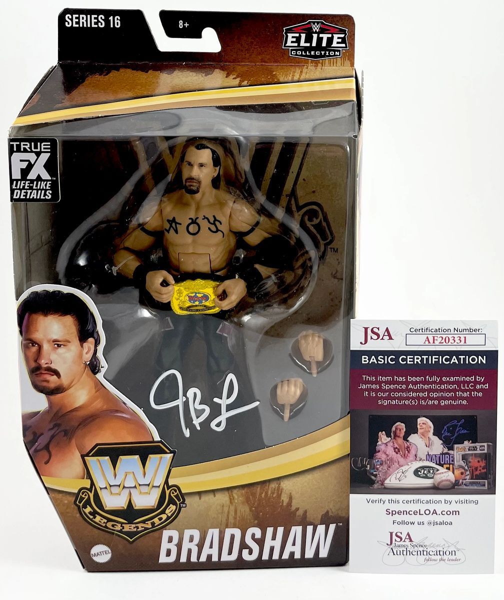 APA Bradshaw WWE Mattel Legends Elite Series 16 Wrestling Figure, hand signed by WWE Hall of Fame Superstar, and one half of the APA (Acolytes Protection Agency) Tag Team, John Bradshaw Layfield. Following his run as a member of the APA, Bradshaw went on to have a successful singles career as the JBL character, winning the WWE Championship. This is a clean, well placed signature, signed in a flowing White 2 MM Molotow paint pen that really pops off of the plastic. Item has been authenticated by James Spence Authentications, and includes the JSA Certificate of Authenticity card.