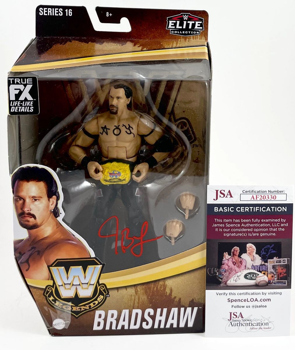APA Bradshaw WWE Mattel Legends Elite Series 16 Wrestling Figure, hand signed by WWE Hall of Fame Superstar, and one half of the APA (Acolytes Protection Agency) Tag Team, John Bradshaw Layfield. Following his run as a member of the APA, Bradshaw went on to have a successful singles career as the JBL character, winning the WWE Championship. This is a clean, well placed signature, signed in a flowing Red 2 MM Molotow paint pen that really pops off of the plastic. Item has been authenticated by James Spence Authentications, and includes the JSA Certificate of Authenticity card. JSA COA# AF20330