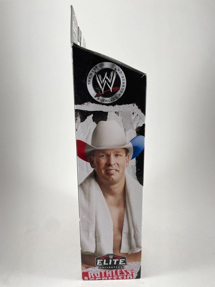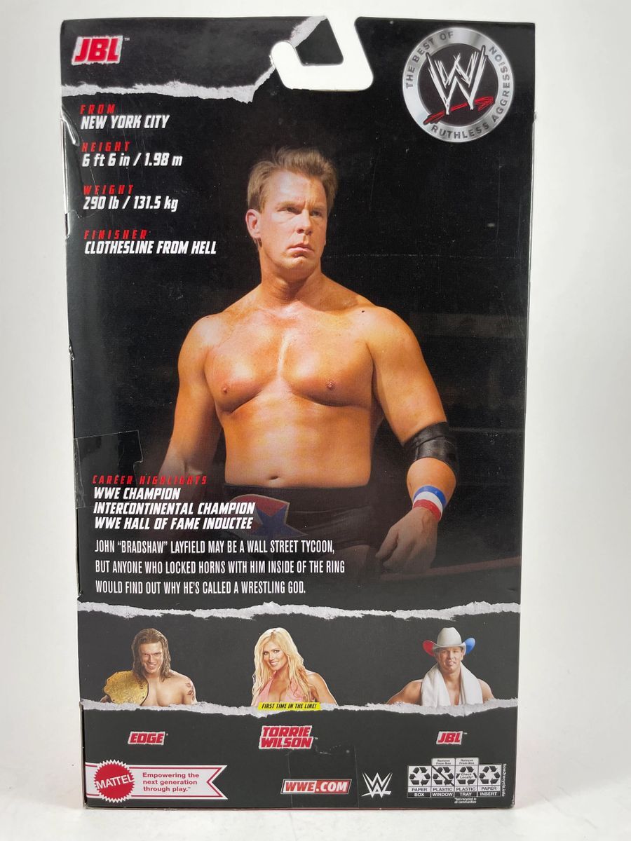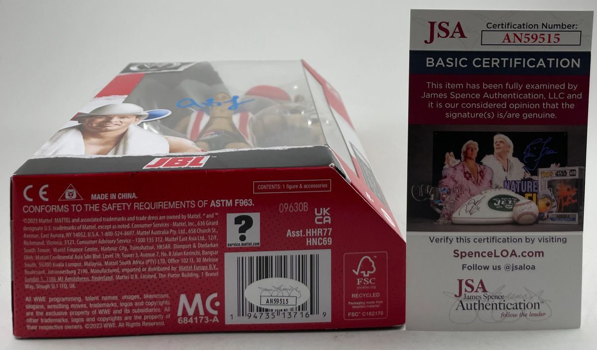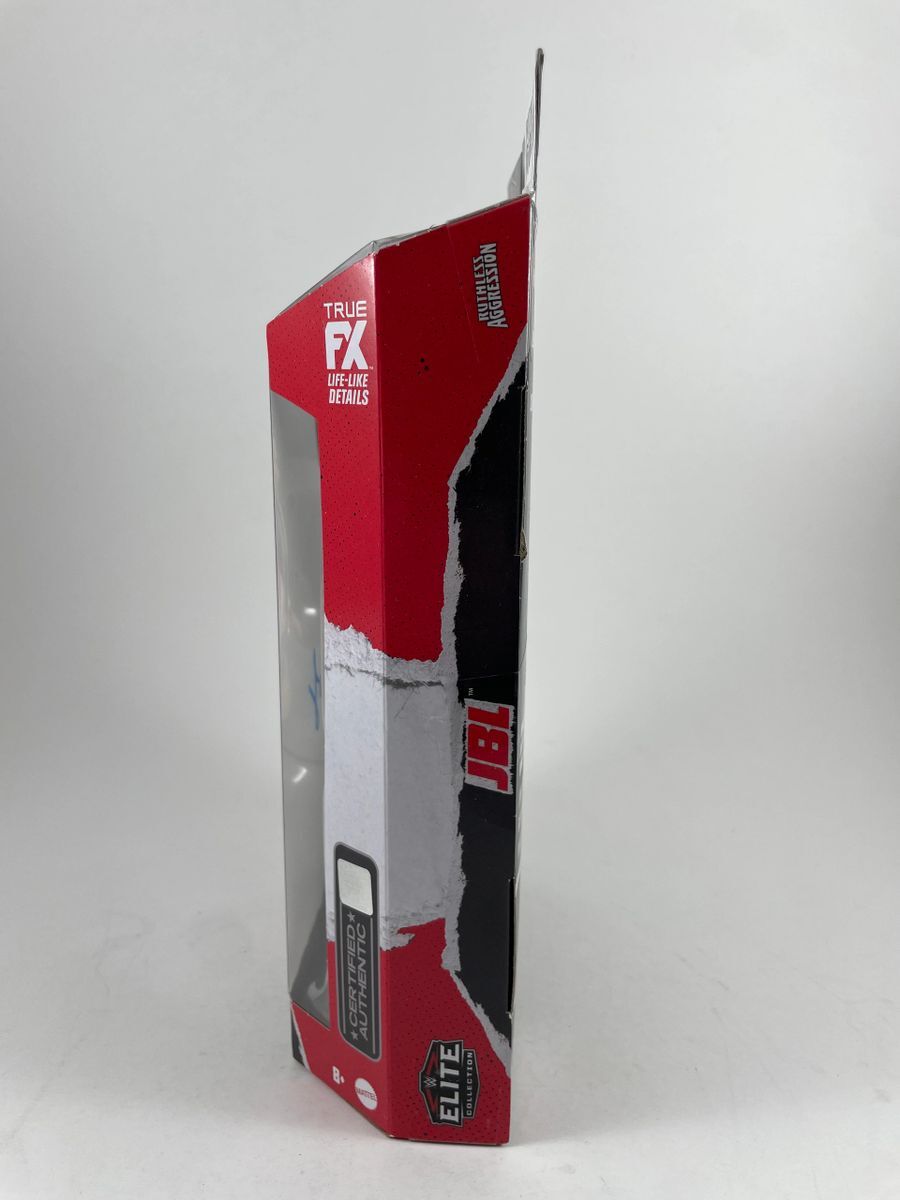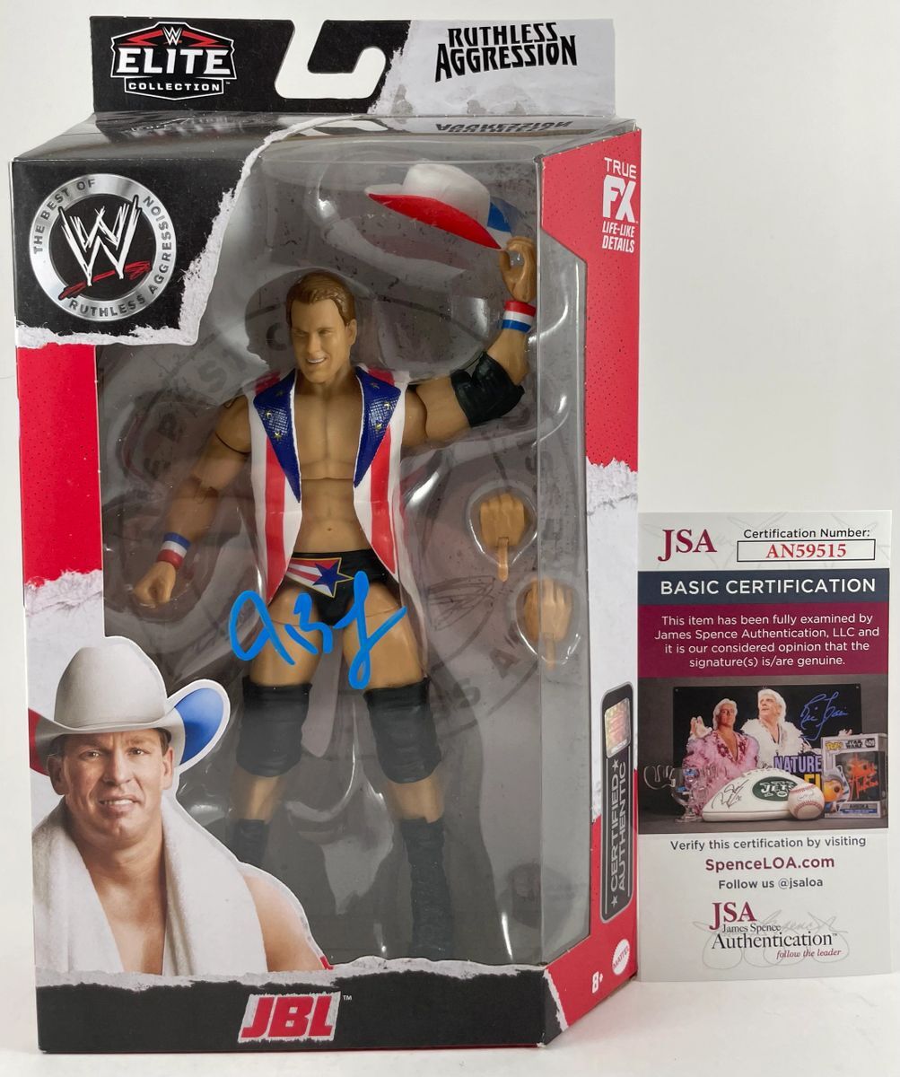 JBL WWE Mattel Elite Ruthless Aggression Wrestling Figure, hand signed in person by WWE Hall of Fame Superstar, John Bradshaw Layfield aka JBL. This is a clean, well placed signature, signed in a flowing Blue 2 MM Decco paint pen that really pops off of the plastic. Item has been authenticated by James Spence Authentications, one of the most reputable third-party authentication companies in the world and includes the JSA Certificate of Authenticity card.