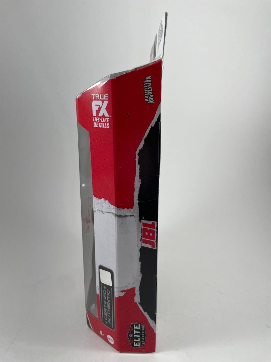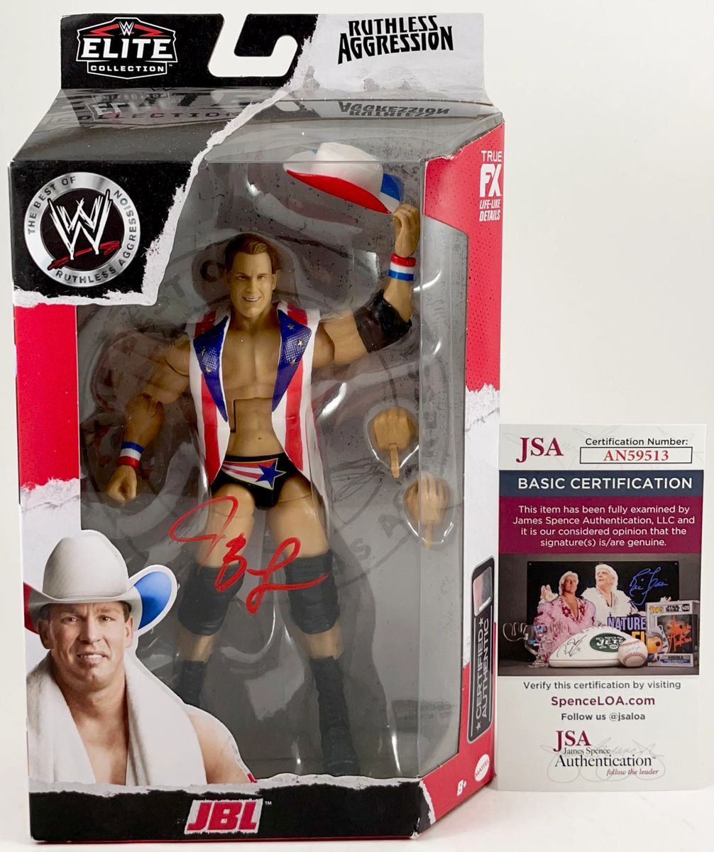 JBL WWE Mattel Elite Ruthless Aggression Wrestling Figure, hand signed in person by WWE Hall of Fame Superstar, John Bradshaw Layfield aka JBL. This is a clean, well placed signature, signed in a flowing Red 2 MM Molotow paint pen that really pops off of the plastic. Item has been authenticated by James Spence Authentications, and includes the JSA Certificate of Authenticity card. JSA COA# AN59513