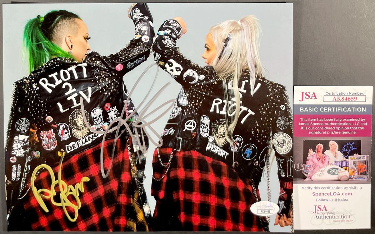 Professionally printed 8×10 photo, hand signed by two of the original three WWE Riott Squad members, former WWE Smackdown Women’s Champion Liv Morgan and Ruby Riott who currently competes in All Elite Wrestling (AEW) as Ruby Soho. This is two clean, well placed signatures that really pop off of this crisp, professionally printed 8×10 photo. Item has been authenticated by James Spence Authentications, and includes the JSA Certificate Of Authenticity card. JSA COA# AK84659