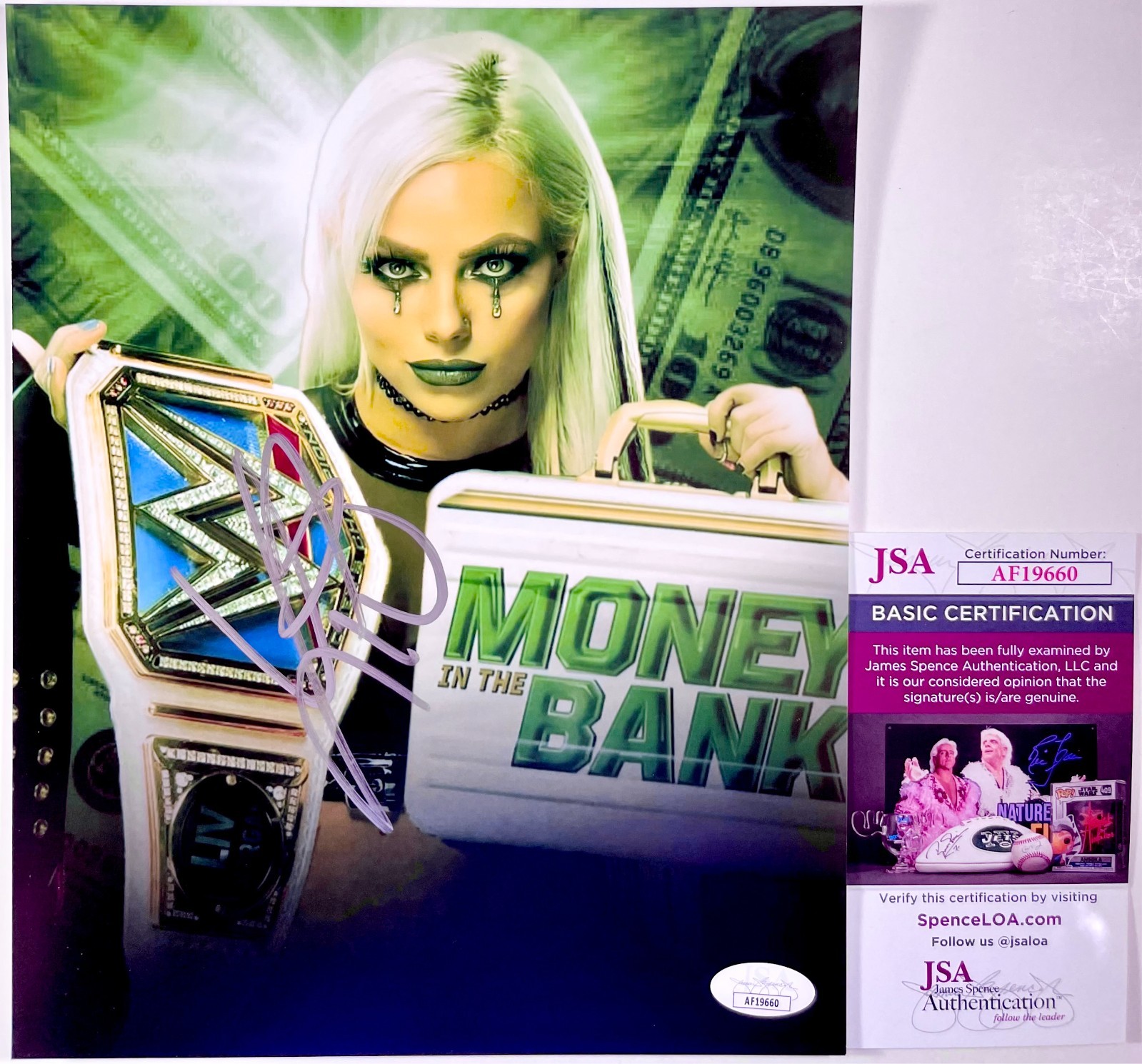 Professionally printed WWE Liv Morgan Money In The Bank Custom Edit 8×10 Photo, hand signed in person by two-time WWE Women’s World Champion and former one half of the WWE Women’s Tag Team Champions, and 2022 WWE Women’s Money In The Bank (MITB) winner, the lovely Liv Morgan of the Judgment Day faction.  This is a clean, well placed signature, signed in a flowing Silver Recollections that really pops off of this crisp, professionally printed 8×10 Photo.  A clear plastic 8×10 toploader is included with purchase to safely ship the photo inside of.  Item has been authenticated by James Spence Authentication, one of the most reputable third-party authentication companies in the world, and includes the JSA Certificate Of Authenticity card.