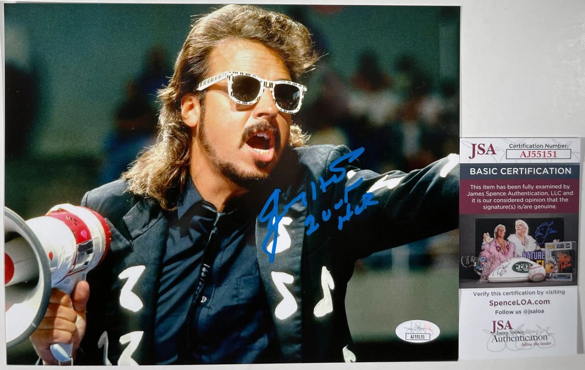 Professionally printed 8×10 photo, hand signed by WWE Hall Of Fame Manager, “The Mouth Of The South” Jimmy Hart. Jimmy is considered one of the greatest managers in the history of the business working in both the WWF and WCW and managing such superstars as Hulk Hogan, The Hart Foundation, The Mountie, The Earthquake, The Honky Tonk Man, and Money Inc just to name a few. This is a clean, well placed signature that really pops off of this crisp, professionally printed 8×10 photo. Item has been authenticated by James Spence Authentications, and includes the JSA Certificate Of Authenticity card.