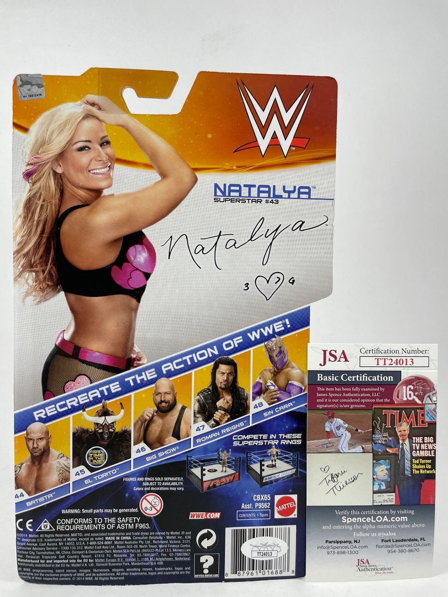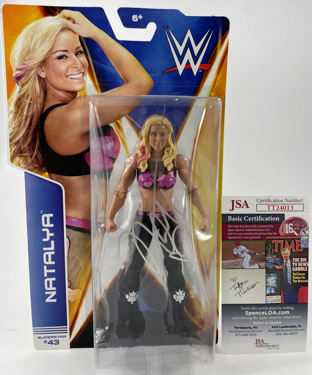 Natalya WWE Mattel Basic Series 42 Wrestling Figure, hand signed by WWE Superstar, and former multiple time WWE Women’s Champion Natalya. This is a clean, well placed signature that really pops off of the plastic. Item has been authenticated by James Spence Authentications, and includes the JSA Certificate of Authenticity card.