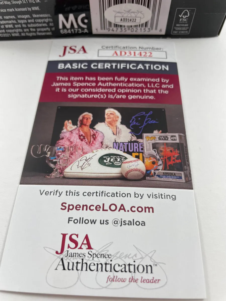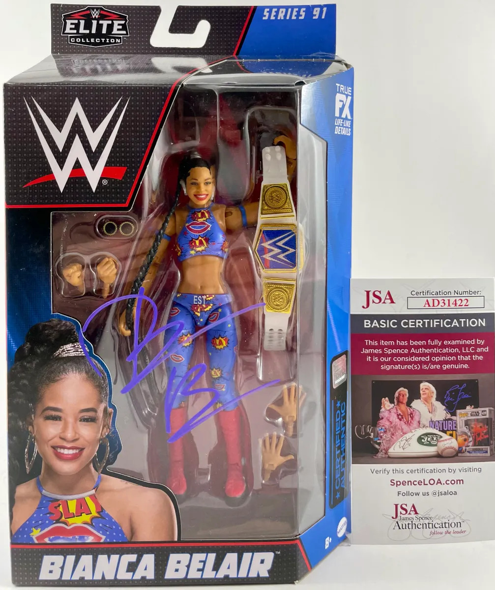 Bianca Belair WWE Mattel Elite Series 91 Wrestling Figure, hand signed in person by three-time WWE Women’s World Champion, the EST of WWE… Bianca Belair. This is a clean, perfectly placed signature, signed in a flowing Purple 2MM DECCO Paint Pen that really pops off of the plastic. Please see photos before purchasing as there are minor flaws to the packaging, however figure still displays incredibly as you can see in the photographs, Item has been authenticated by James Spence Authentications, one of the most reputable third-party authentication companies in the world, and includes the JSA Certificate of Authenticity card. JSA COA# AD31422