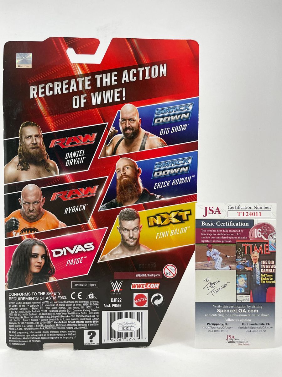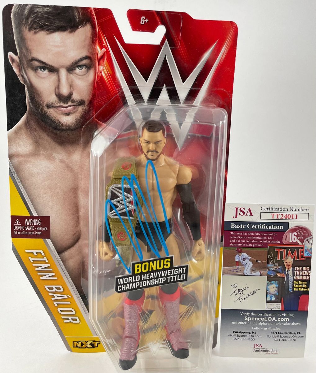 Finn Balor WWE Mattel Basic Series 57 Bonus World Heavyweight Championship Title Chase Wrestling Figure, hand signed by WWE Superstar “The Demon” Finn Balor. This is a clean, well placed signature, signed in a flowing Blue Decco paint pen that really pops off of the plastic. Item has been authenticated by James Spence Authentications, and includes the JSA Certificate of Authenticity card.
