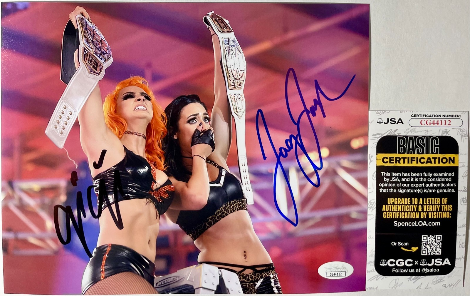 Professionally printed Toxic Attraction 8×10 photo, hand signed in person by two-time WWE NXT Women’s Tag Team Champions, Gigi Dolin and Jacy Jayne, collectively known as Toxic Attraction. This is two clean, well placed signatures that really pop off of this crisp, professionally printed 8×10 photo. A clear plastic 8×10 toploader is included with purchase to safely ship the photo inside of. Item has been authenticated by James Spence Authentication, one of the most reputable third-party authentication companies in the world, and includes the JSA Certificate Of Authenticity card.
