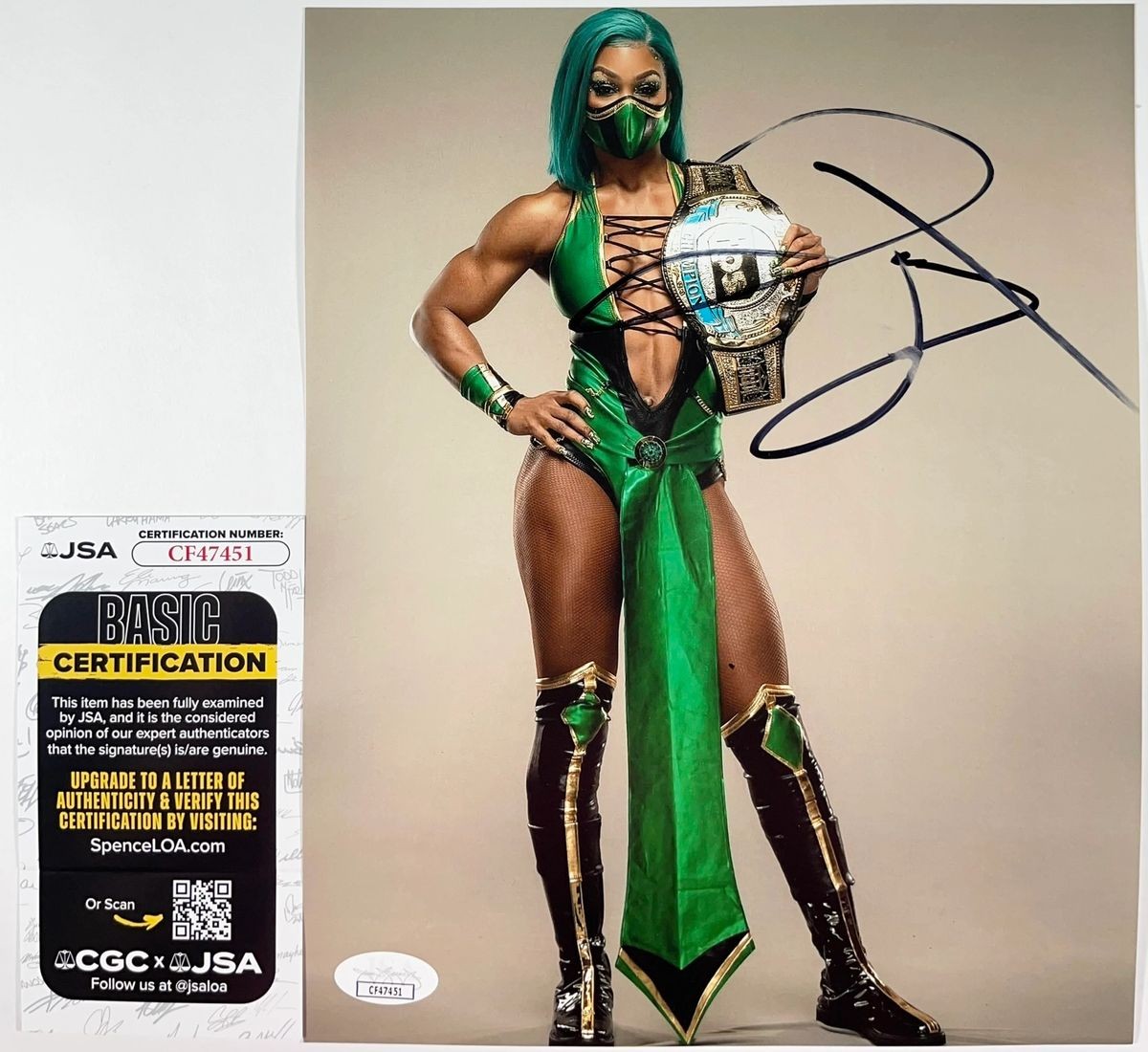Professionally printed 8×10 photo, hand signed in person by former All Elite Wrestling (AEW) TBS Champion and 2025 WWE Queen Of The Ring, Jade Cargill. This is a clean, well placed signature, signed in a flowing Black Sharpie that really pops off of this crisp, professionally printed 8×10 photo. A clear plastic 8×10 toploader is included with purchase to safely ship the photo inside of. Item has been authenticated by James Spence Authentications, one of the most reputable third-party authentication companies in the world, and includes the JSA Certificate Of Authenticity card. JSA COA# CF47451
