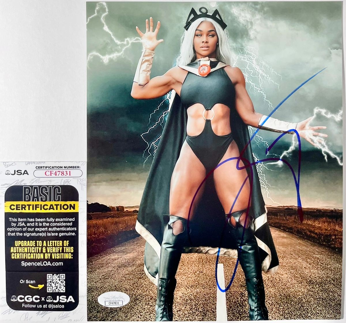 Professionally printed 8×10 photo, hand signed in person by former All Elite Wrestling (AEW) TBS Champion and 2025 WWE Queen Of The Ring, Jade Cargill. This is a clean, well placed signature, signed in a flowing Blue Sharpie that really pops off of this crisp, professionally printed 8×10 photo. A clear plastic 8×10 toploader is included with purchase to safely ship the photo inside of. Item has been authenticated by James Spence Authentications, one of the most reputable third-party authentication companies in the world, and includes the JSA Certificate Of Authenticity card. JSA COA# CF47831