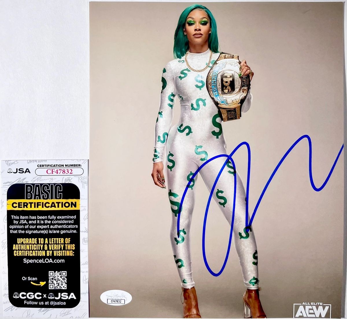Professionally printed 8×10 photo, hand signed in person by former All Elite Wrestling (AEW) TBS Champion and 2025 WWE Queen Of The Ring, Jade Cargill. This is a clean, well placed signature, signed in a flowing Blue Sharpie that really pops off of this crisp, professionally printed 8×10 photo. A clear plastic 8×10 toploader is included with purchase to safely ship the photo inside of. Item has been authenticated by James Spence Authentications, one of the most reputable third-party authentication companies in the world, and includes the JSA Certificate Of Authenticity card. JSA COA# CF47832