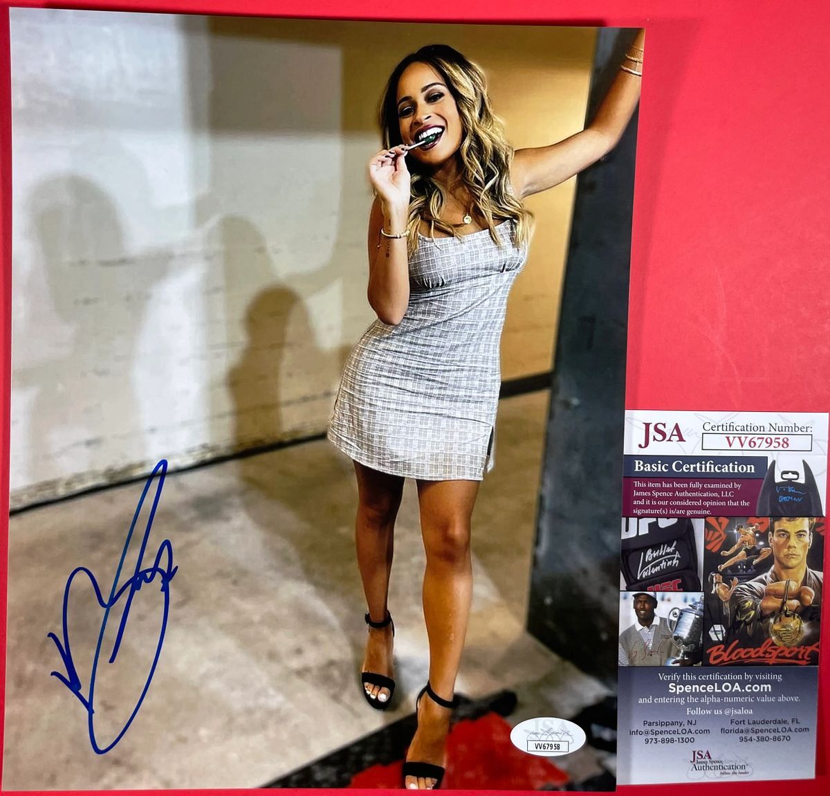 Professionally printed 8×10 photo, hand signed by WWE Backstage Announcer, the lovely Kayla Braxton. This is a clean, well placed signature, that really pops off of this crisp, professionally printed 8×10 photo. Item has been authenticated by James Spence Authentications, and includes the JSA Certificate Of Authenticity card. JSA COA# VV67958