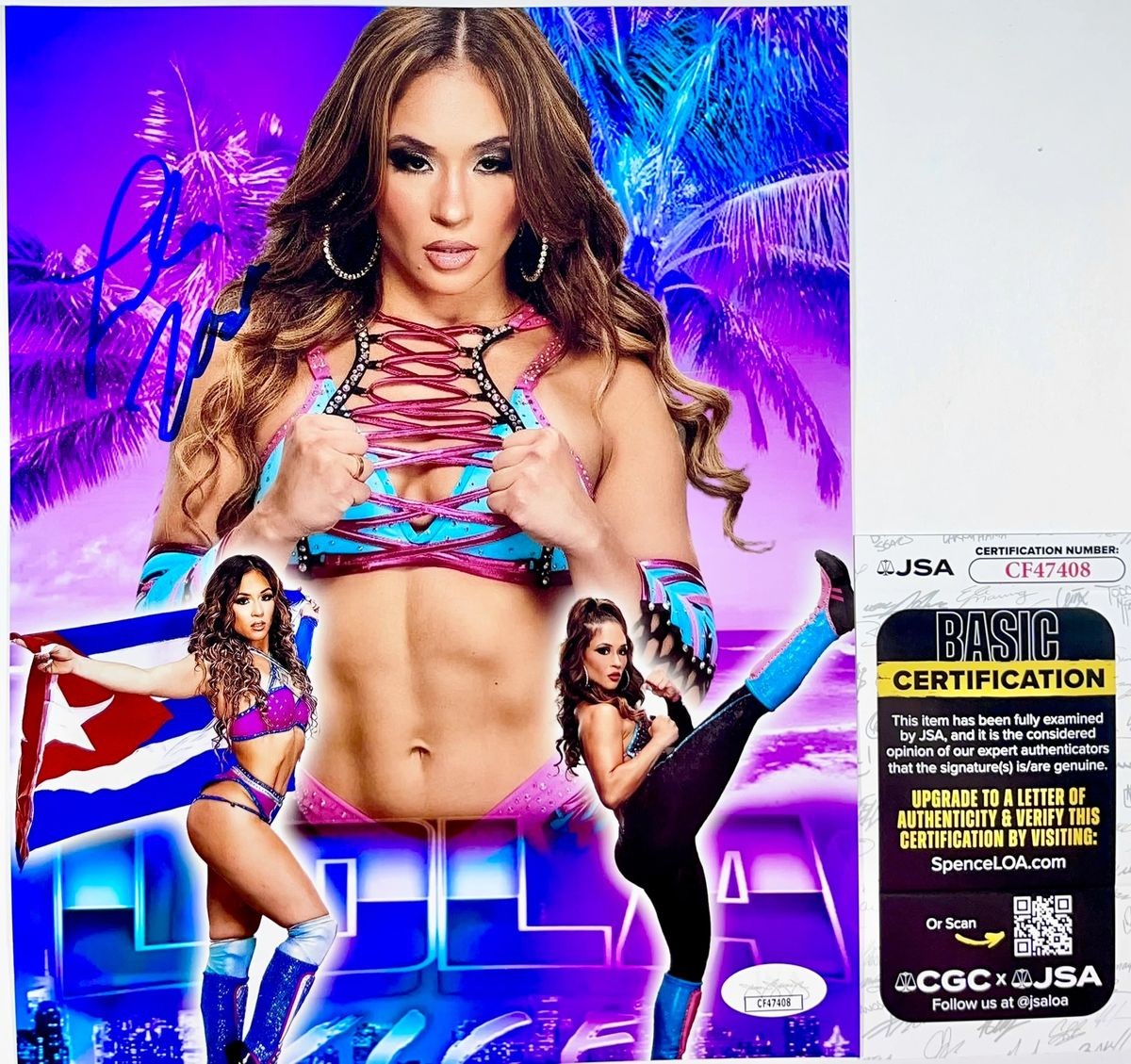 Professionally printed 8×10 photo, hand signed in person by former Bellator MMA Flyweight Fighter, currently competing in WWE’s NXT brand, and about to do a stint with AAA, the absolutely stunning Lola Vice aka Valerie Loureda. This is a clean, well placed signature, signed in a flowing Blue Sharpie that really pops off of this crisp, professionally printed 8×10 photo. A clear plastic 8×10 toploader is included with purchase to safely ship the photo inside of. Item has been authenticated by James Spence Authentications, one of the most reputable third-party authentication companies in the world, and includes the JSA Certificate Of Authenticity card. JSA COA# CF47408