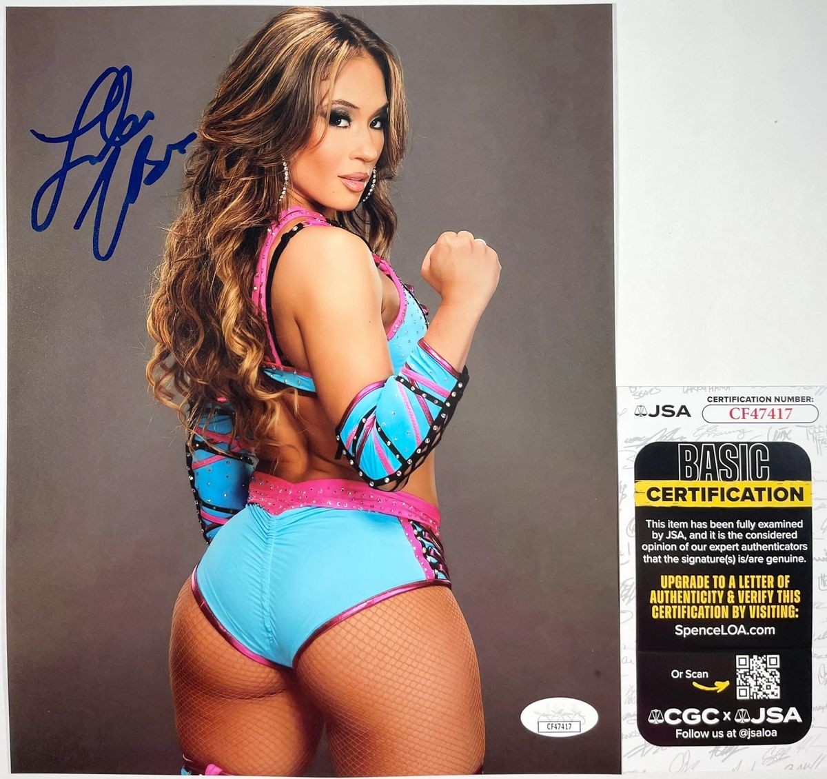 Professionally printed 8×10 photo, hand signed in person by former Bellator MMA Flyweight Fighter, currently competing in WWE’s NXT brand, and about to do a stint with AAA, the absolutely stunning Lola Vice aka Valerie Loureda. This is a clean, well placed signature, signed in a flowing Blue Sharpie that really pops off of this crisp, professionally printed 8×10 photo. A clear plastic 8×10 toploader is included with purchase to safely ship the photo inside of. Item has been authenticated by James Spence Authentications, one of the most reputable third-party authentication companies in the world, and includes the JSA Certificate Of Authenticity card. JSA COA# CF47417