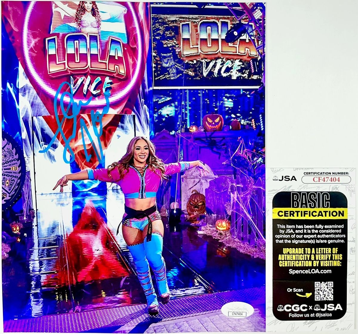 Professionally printed 8×10 photo, hand signed in person by former Bellator MMA Flyweight Fighter, currently competing in WWE’s NXT brand, and about to do a stint with AAA, the absolutely stunning Lola Vice aka Valerie Loureda. This is a clean, well placed signature, signed in a flowing Blue 2MM DECCO Paint Pen that really pops off of this crisp, professionally printed 8×10 photo. A clear plastic 8×10 toploader is included with purchase to safely ship the photo inside of. Item has been authenticated by James Spence Authentications, one of the most reputable third-party authentication companies in the world, and includes the JSA Certificate Of Authenticity card. JSA COA# CF47404