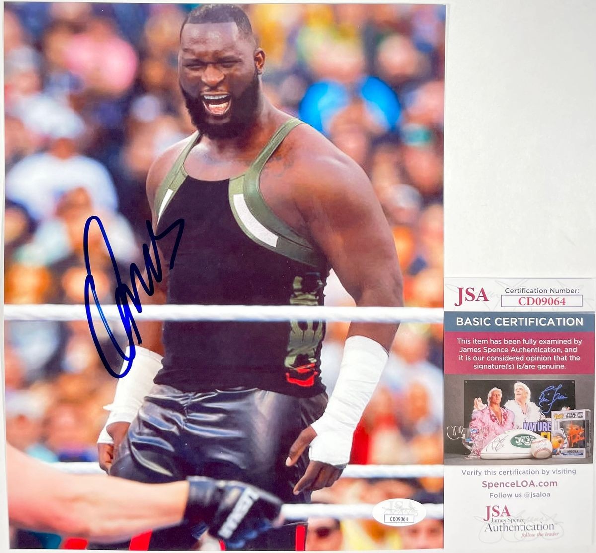 Professionally printed 8×10 photo, hand signed in person by a former co-holder of the WWE World Tag Team Championships with “The Phenomenal” AJ Styles, the “Nigerian Nightmare” Omos. This is a clean, well placed signature, signed in a flowing Blue Sharpie that really pops off of this crisp, professionally printed 8×10 photo. A clear plastic 8×10 toploader is included with purchase to safely ship the photo inside of. Item has been authenticated by James Spence Authentications, one of the most reputable third-party authentication companies in the world and includes the JSA Certificate Of Authenticity card.