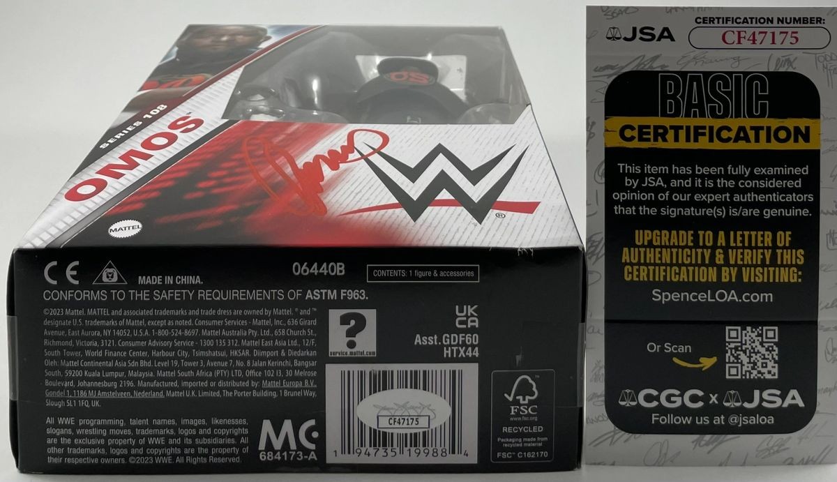 Omos WWE Mattel Elite Series 108 Wrestling Figure, hand signed in person by WWE Superstar, the “Nigerian Giant” Omos. This is a clean, well placed signature, signed in a flowing Red 2MM Molotow Paint Pen that really pops. Packaging has some minor flaws, however overall displays very nicely as you can see in the photos. Item has been authenticated by James Spence Authentications, one of the most reputable third-party authentication companies in the world and includes the JSA Certificate of Authenticity card. JSA COA# CF47175