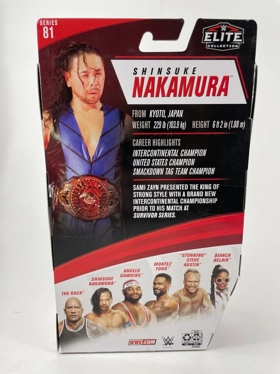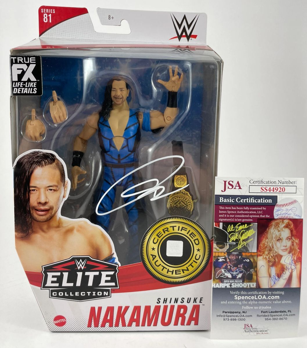 Shinsuke Nakamura WWE Mattel Elite Series 81 Wrestling Figure, hand signed by WWE Superstar, Shinsuke Nakamura. This is a clean, perfectly placed signature, signed in a flowing White 2 MM Molotow paint pen that really pops off of the plastic. Item has been authenticated by James Spence Authentications, and includes the JSA Certificate of Authenticity card.