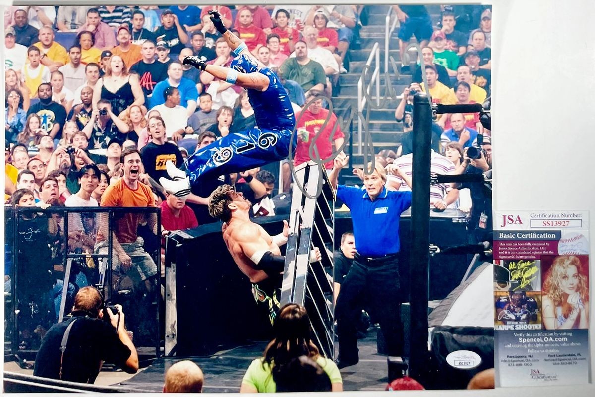 Professionally printed 11×14 photo, hand signed in person by the 21st Triple Crown Champion and 21st Grand Slam Champion in WWE history, Lucha Libre legend, Rey Mysterio Jr. This is a clean, well placed signature, signed in a flowing Silver DECCO Paint Pen that really pops off of this crisp, professionally printed 11×14 photo. A clear plastic 11×14 toploader is included with purchase to safely ship the photo inside of. Item has been authenticated by James Spence Authentications, one of the most reputable third-party authentication companies in the world, and includes the JSA Certificate Of Authenticity card. JSA COA# SS13927
