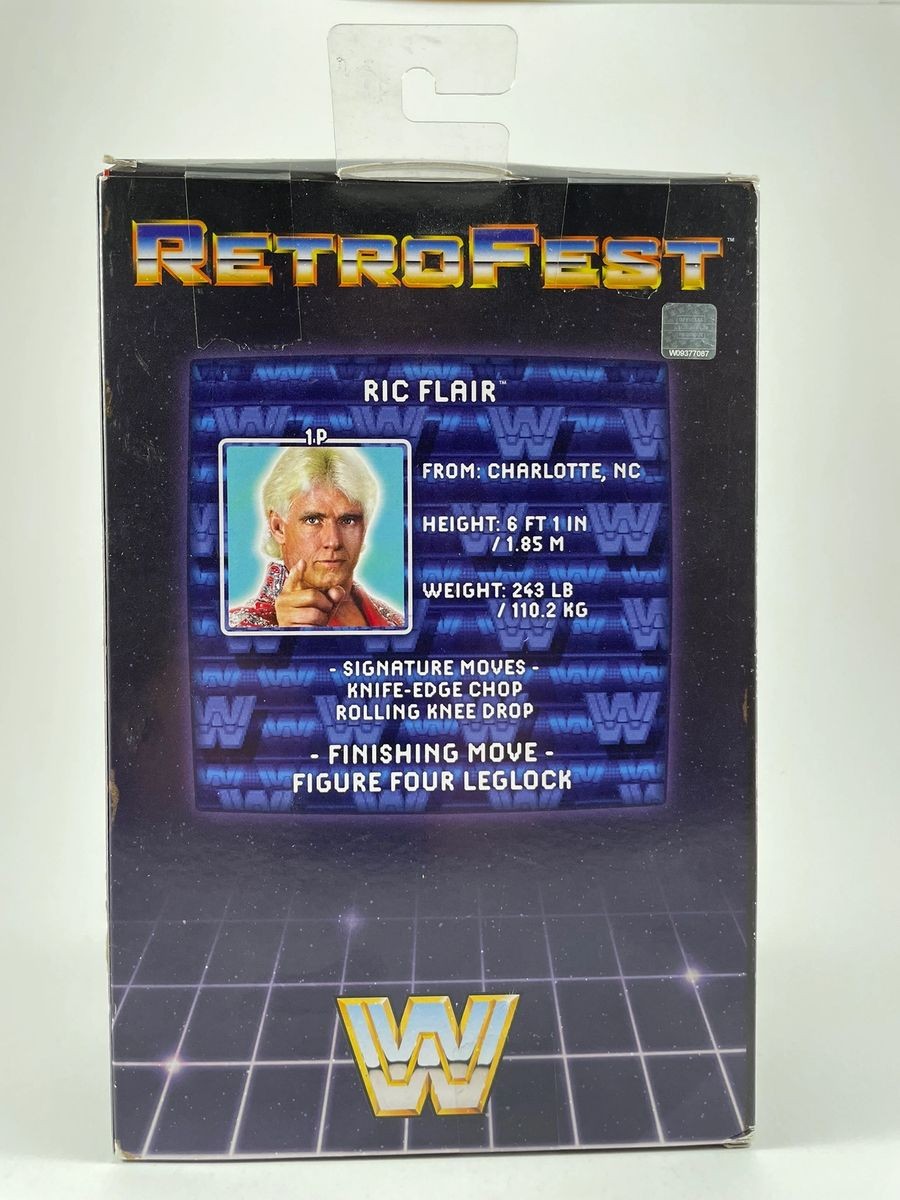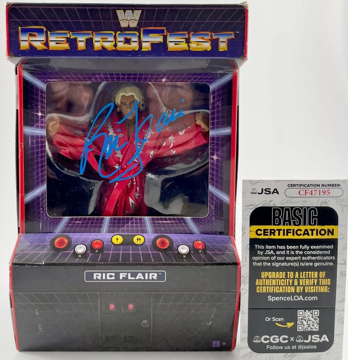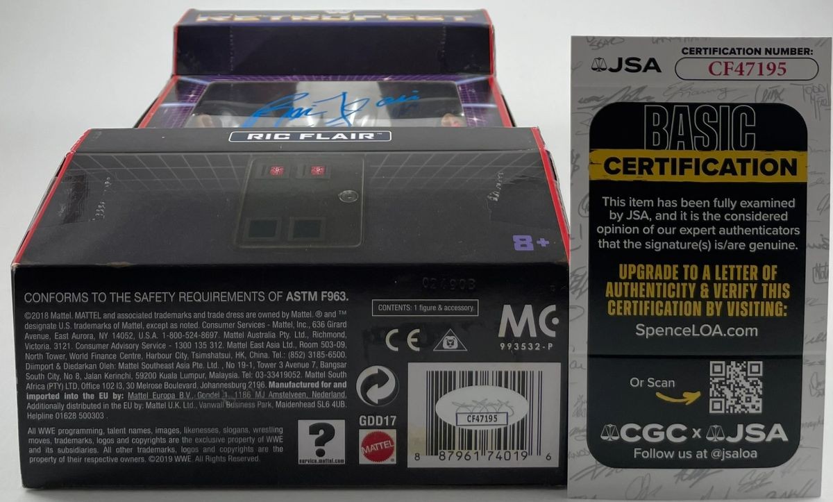 Ric Flair WWE Mattel Retrofest GameStop Exclusive Wrestling Figure, hand signed in person by wrestling icon the sixteen-time World Heavyweight Champion, “The Nature Boy” Ric Flair. This is a clean, well placed signature, signed in a flowing Blue 2MM DECCO Paint Pen that really pops off of the plastic. Please make note the box is not being sold as mint as there are some little flaws to the packagaing as you can see in the photos. Figure still displays great, Item has been authenticated by James Spence Authentications, one of the most reputable third-party authentication companies in the world, and includes the JSA Certificate of Authenticity card.