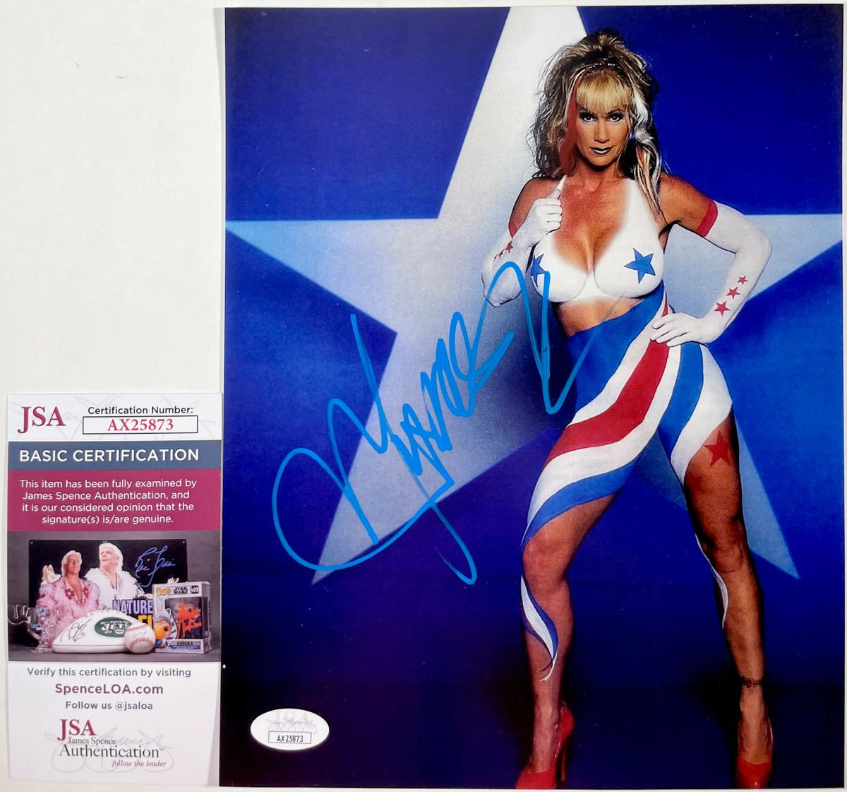 Professionally printed 8×10 photo, hand signed in person by former AWA Women’s World Champion and former WCW Cruiserweight Champion Madusa who is also a WWE Hall Of Fame Superstar under the ring name Alundra Blayze. This is a clean, well placed signature, signed in a flowing Blue 2MM DECCO Paint Pen that really pops off of this crisp, professionally printed 8×10 photo. Photo will ship inside of a clear plastic toploader. Item has been authenticated by James Spence Authentications, one of the most reputable third-party authentication companies in the world and includes the JSA Certificate Of Authenticity card.