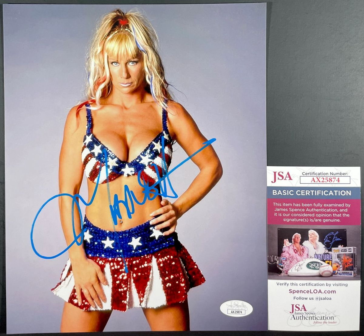 Professionally printed 8×10 photo, hand signed in person by former AWA Women’s World Champion and former WCW Cruiserweight Champion Madusa who is also a WWE Hall Of Fame Superstar under the ring name Alundra Blayze. This is a clean, well placed signature, signed in a flowing Blue 2MM Decco Paint Pen that really pops off of this crisp, professionally printed 8×10 photo. Item has been authenticated by James Spence Authentications, one of the most reputable third-party authentication companies in the world and includes the JSA Certificate Of Authenticity card.