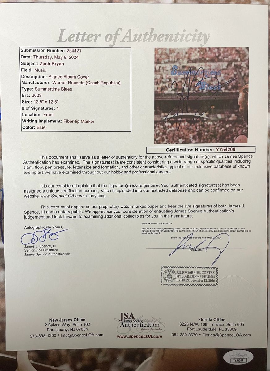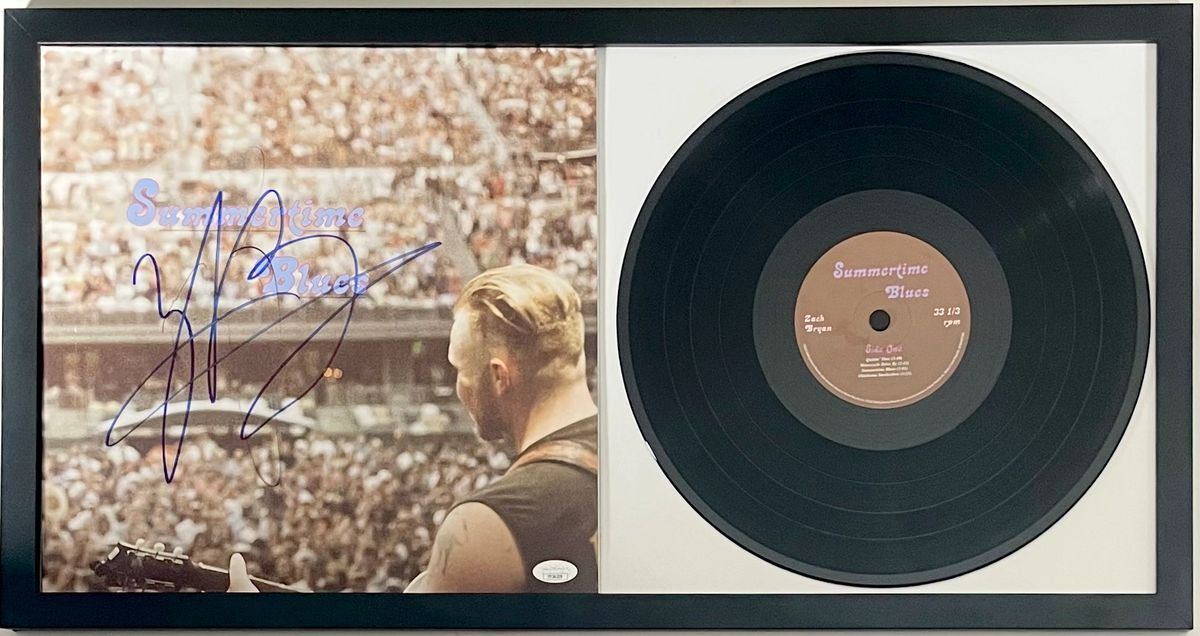 Zach Bryan Summertime Blues 12″ Vinyl Record with Dust Jacket, hand signed in person by Country Music mega-star Zach Bryan. This is a perfectly placed signature, signed in a flowing Blue Sharpie that really pops off of this Zach Bryan Summertime Blues dust jacket with 12″ Vinyl Record inside of this amazing framed display. Please make note technically the item was signed twice as Zach went to sign it first with a completely dead Sharpie but later signed it with a beautiful flowing Blue Sharpie. Looks amazing. Item has been authenticated by James Spence Authentications, one of the most reputable third-party authentication companies in the world and includes the JSA Letter Of Authenticity.